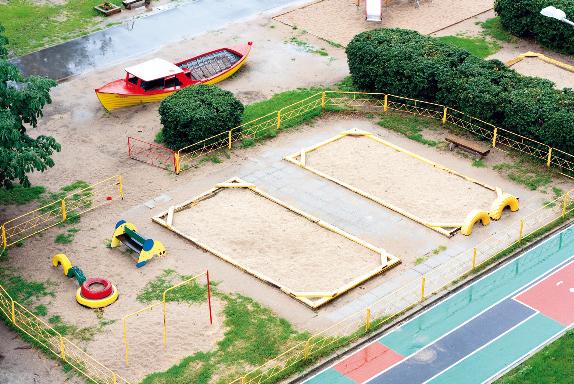 Для любой детской площадки лучше использовать "мягкое" покрытие — дерн, песок, гравий или опилки. Прежде чем заняться ее обустройством, необходимо тщательно очистить территорию от выступающих корней, веток, каких-либо металлических перемычек и других строительных элементов. Под самим игровым оборудованием следует положить дополнительные резиновые или синтетические коврики. Наиболее популярным покрытием для детских площадок является газон. Он будет незаменим на участке для спортивных игр и смягчит удар при возможном падении ребенка. Стоит быть готовым к тому, что газон изнашивается быстрее, чем другие покрытия, поэтому предполагает регулярный и тщательный уход. Травосмесь можно выбрать следующую: овсяница красная, мятлик луговой, клевер ползучий. Не забывайте и об уходе за газоном — его нужно регулярно скашивать, а оголившиеся участки восстанавливать. Возможно, газон придется больше поливать и удобрять, а также усилить контроль над сорняками и вредителями. Но при этом, следует избегать использования токсичных химикатов, чтобы предотвратить нежелательное воздействие на людей.Очень популярно стало использование для площадок специальных резиновых покрытий. Они мягкие, нескользящие и наиболее безопасные из всех других видов покрытий, правда, отнюдь не дешевы. А покрытие из резиновой крошки ярких цветов создаст игривую тональность и украсит любую площадку. Покрытия из бетона или натурального камня хороши тем, что они долговечны, на них не застаивается вода. Но, вместе с тем, — достаточно травмоопасны, потому используются крайне редко. Деревянное покрытие используется лишь в том случае, если оно тщательно отшлифовано, а все гвозди утоплены в дерево. Самый лучший вариант — это комбинирование нескольких видов покрытий на отдельных зонах детских площадок. Например, в игровой зоне можно использовать деревянное или резиновое покрытие для детских площадок, в зоне спортивных игр — газон, а для велосипедной дорожки выбрать бетон.